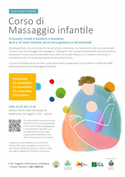 Prende il via presso l'asilo nido comunale di Madruzzo, via Lagolo 11/A a Lasino, un ciclo di 4 incontri di massaggio infantile dedicato a bambini e bambine da 0 a 12 mesi insieme a un genitore (o entrambi).