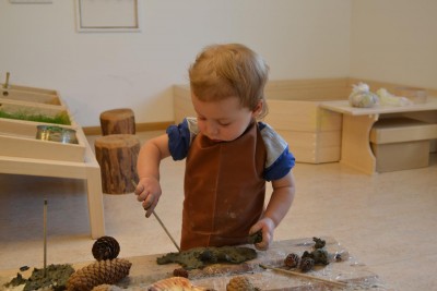 I bambini del Nido La Giostra di Albiano si sono ritrovati tutti insieme al tavolo del salone sul quale hanno trovato conchiglie, pigne, ossi di pesca, acqua e creta. I bambini hanno poi manipolato il materiale e si sono inventati modi nuovi per lavorare la creta.